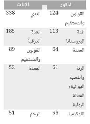 ويوضح الجدول التالي أهم السرطانات شيوعا بين العمانيين الذكور والإناث.
