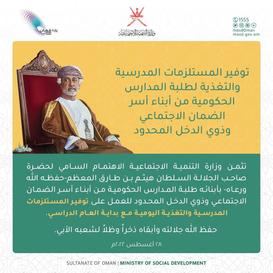 ثمنت وزارة التنمية الاجتماعية الاهتمام السامي لحضرة صاحب الجلالة السلطان هيثم بن طارق المعظم-حفظه الله ورعاه- بأبنائه طلبة المدارس الحكومية من أبناء أسر الضمان الاجتماعي وذوي الدخل المحدود للعمل على توفير المستلزمات المدرسية والتغذية اليومية مع بداية العام الدراسي.