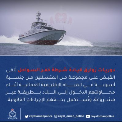 دوريات زوارق قيادة شرطة خفر السواحل تُلقي القبض على مجموعة من المتسللين من جنسية آسيوية في المياه الإقليمية العمانية أثناء محاولتهم الدخول إلى البلاد بطريقة غير مشروعة، وتُستكمل بحقهم الإجراءات القانونية.