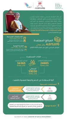 أصدرت وزارة التنمية الاجتماعية توضيحًا بشأن الاهتمام السامي من لدن حضرة صاحب الجلالة السلطان هيثم بن طارق -حفظه الله ورعاه- بأبنائه الطلبة من أسر الضمان الاجتماعي والدخل المحدود؛ للعمل على توفير المستلزمات المدرسية والتغذية اليومية.