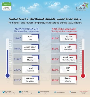 نشرت الأرصاد الجوية العمانية في حسابها الرسمي عبر موقع “تويتر” درجات الحرارة العظمى والصغرى المسجلة خلال 24 ساعة الماضية.
