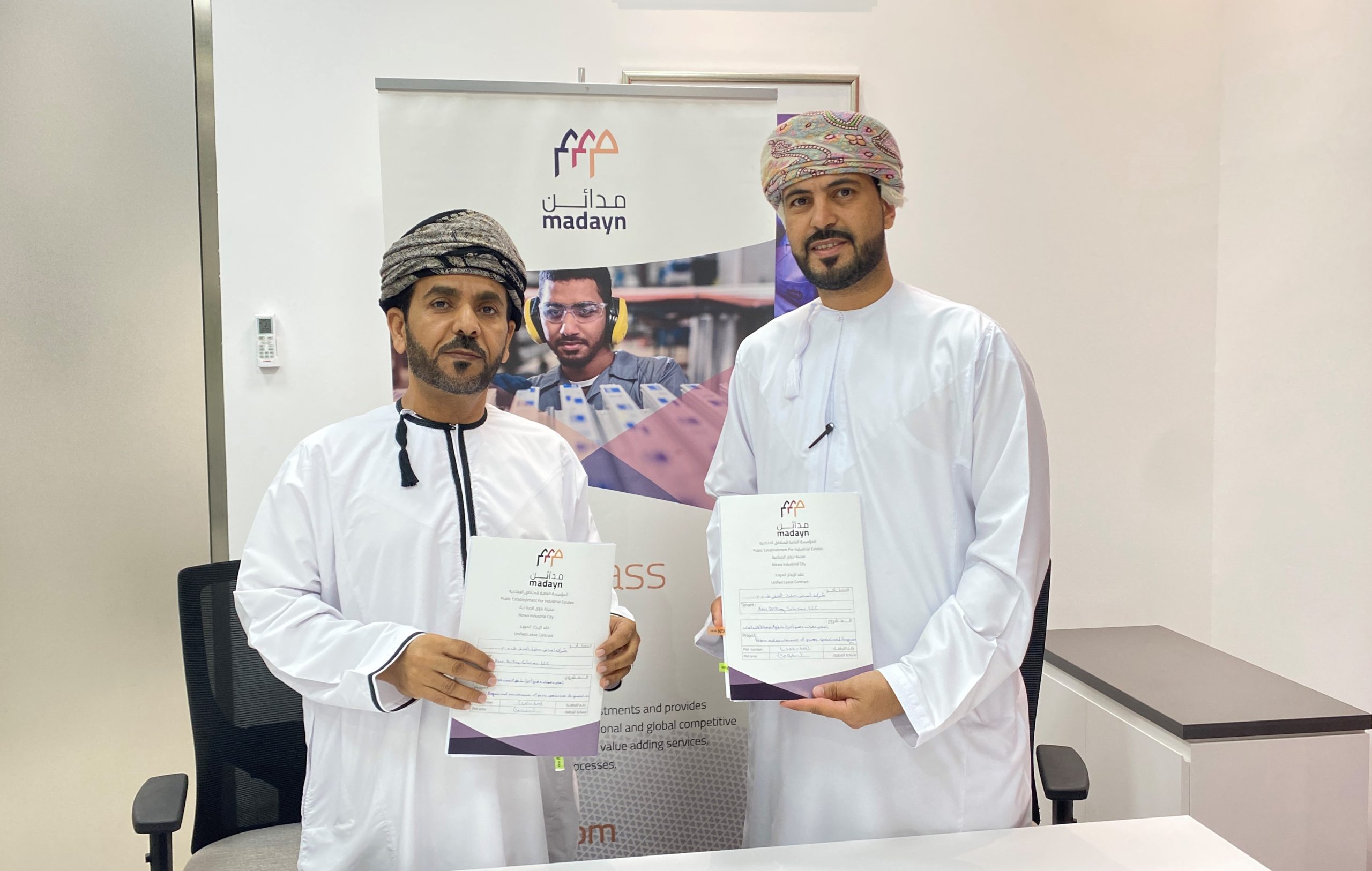 وقّع العقد من جانب المؤسسة العامة للمناطق الصناعية “مدائن”، أحمد بن سالم الحجري، مدير عام مدينة نزوى الصناعية، بينما وقعه من جانب الشركة خالد بن حمد البوسعيدي، مالك المشروع.