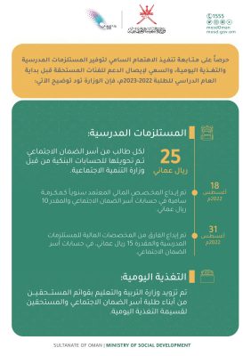 حرصاً لمتابعة تنفيذ الاهتمام السامي لحضرة صاحب الجلالة السلطان هيثم بن طارق – حفظه الله ورعاه. أكدت وزارة التنمية الاجتماعية على وصول الدعم المخصص للمستلزمات المدرسية لأبناء أسر الضمان الاجتماعي في حساباتهم البنكية.