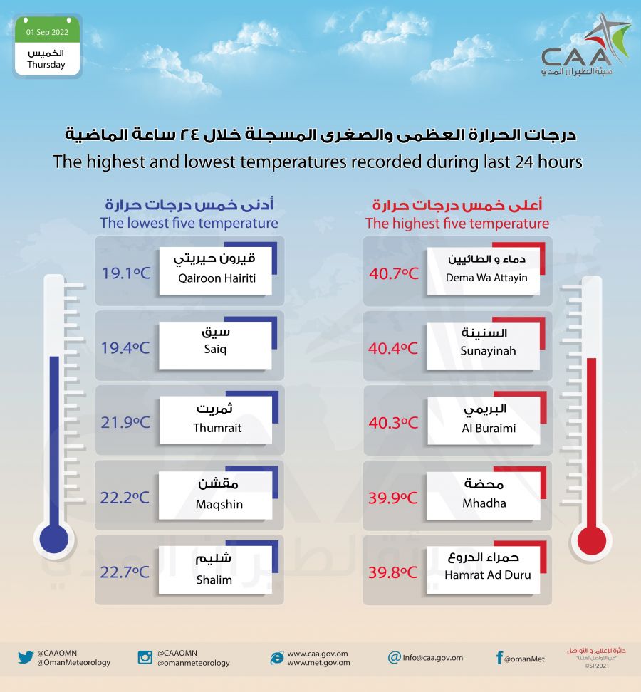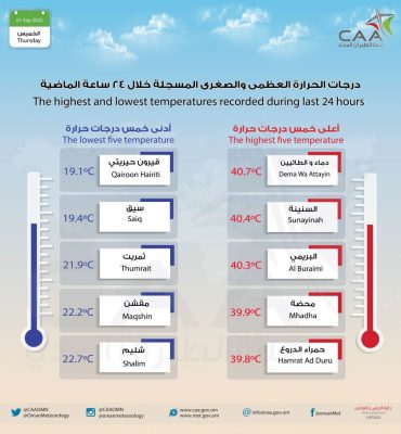 كشفت الأرصاد الجوية العمانية في حسابها الرسمي عبر “تويتر” عن درجات الحرارة العظمى والصغرى المسجلة خلال الـ 24 ساعة الماضية.