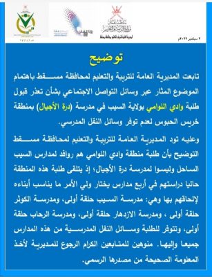 وهج الخليج - مسقط أصدرت المديرية العامة للتربية والتعليم لمحافظة مسقط توضيحًا بشأن تعذر قبول طلبة وادي اللوامي بولاية السيب في مدرسة درة الأجيال.
