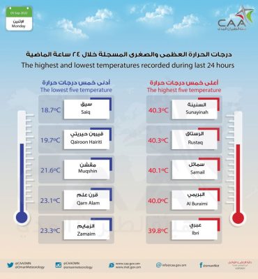 نشرت الأرصاد الجوية العمانية درجات الحرارة المسجلة خلال 24 ساعة الماضية ؛ حيث سجلت السنينة أعلى درجة حرارة وبلغت 40.3 درجة سيليزية، بينما سجلت سيق أدنى درجة حرارة وبلغت 18.7 درجة سيلزية.