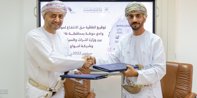 وقّعت وزارة التراث والسياحة اليوم اتفاقيةَ حق انتفاع لتطوير موقع محمية أشجار اللبان بوادي دوكة -المُدرَج ضمن قائمة التراث العالمي لمنظمة اليونسكو- مع شركة أمواج، وقّع الاتفاقية من جانب الوزارة سعادة المهندس إبراهيم بن سعيد بن خلف الخروصي وكيل الوزارة للتراث، فيما وقّعها من جانب شركة أمواج السيد خالد بن حمد بن حمود البوسعيدي رئيس مجلس الإدارة، وذلك بديوان عام الوزارة.