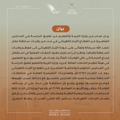 أصدرت وزارة التربية والتعليم عن تعليق الدراسة في المدارس المتضررة من انقطاع التيار الكهربائي في عدد من ولايات سلطنة عمان.