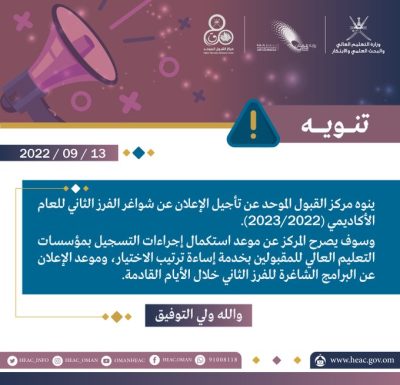 أصدر مركز القبول الموحد تنويهًا بتأجيل الإعلان عن شواغر الفرز الثاني للعام الأكاديمي 2022/2023.