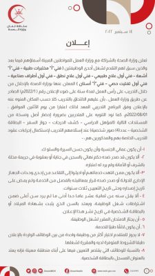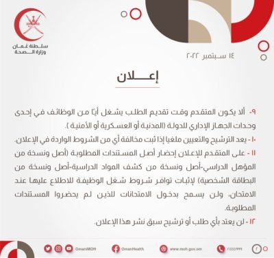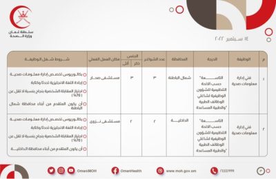 أعلنت وزارة الصحة بالتنسيق مع وزارة العمل عن رغبتها في إعادة الإعلان السابق والمنشور بتاريخ: 23/08/2022م بشأن توفر (84) وظيفة شاغرة ومن بينها وظيفة (فني إدارة معلومات صحية)عليه تود الوزارة التنبيه عن توفر عدد ( 5 ) وظائف شاغرة ( فني إدارة معلومات صحية ) لحملة البكالوريوس.