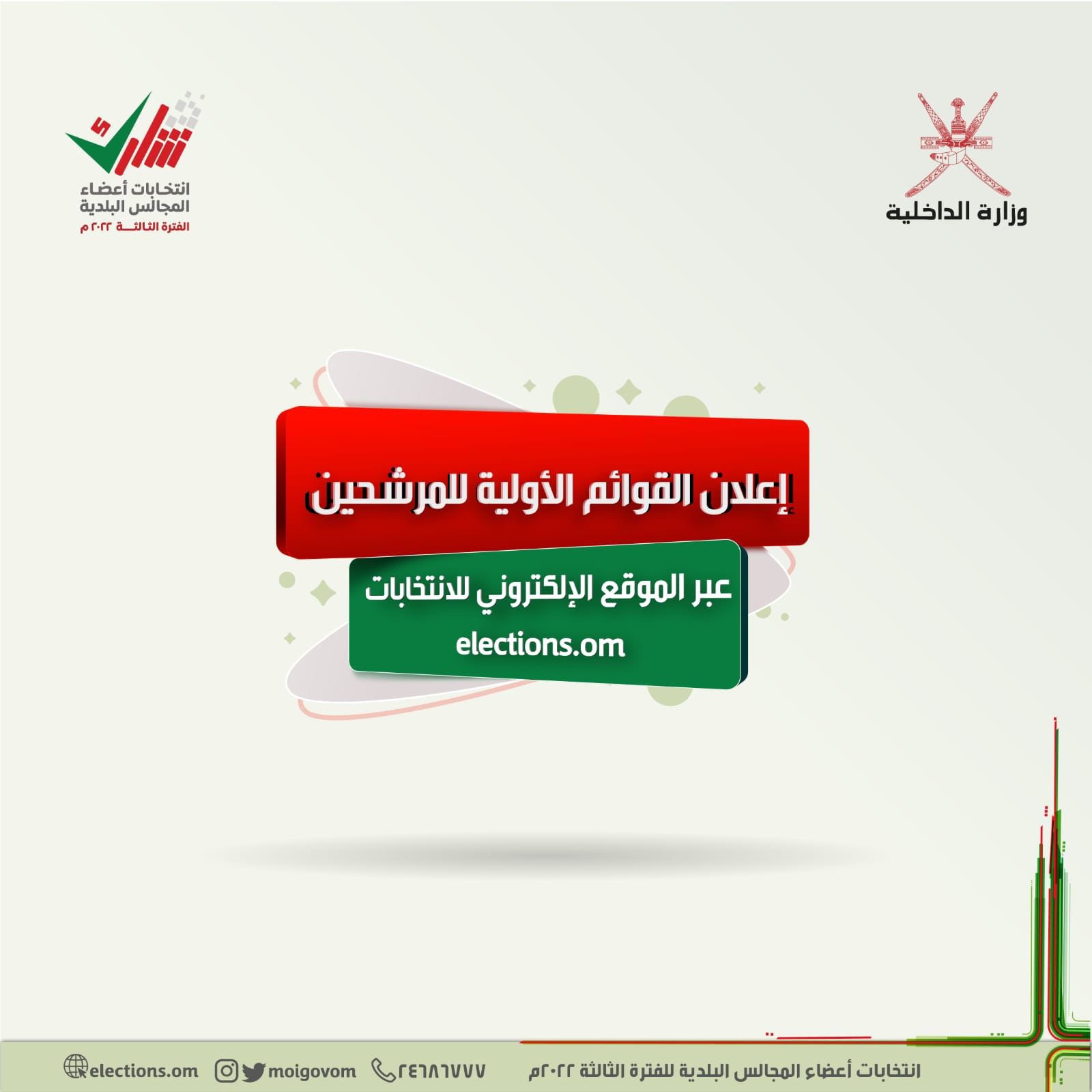 أعلنت وزارة الداخلية القوائم الأولية للمرشحين لعضوية المجالس البلدية للفترة الثالثة، البالغ عددهم (760) مرشحًا ومرشحةً بينهم ( 29) امرأة، عبر الموقع الإلكتروني للانتخابات(elections.om) .
