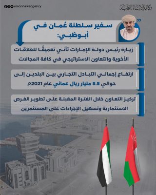 سفير سلطنة عُمان: زيارة رئيس دولة الإمارات العربية المتحدة تعمّق العلاقات والتعاون في كافة المجالات