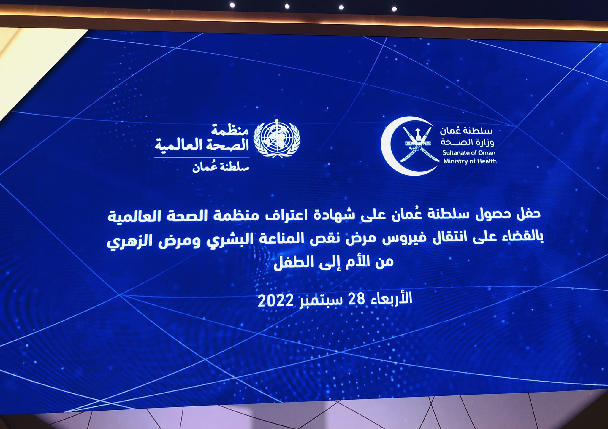 حفل تسليم ⁧‫السلطنة‬⁩ شهادة الاعتراف الدولية بالقضاء على انتقال فيروس مرض نقص المناعة ومرض الزهري من الأم إلى الطفل.