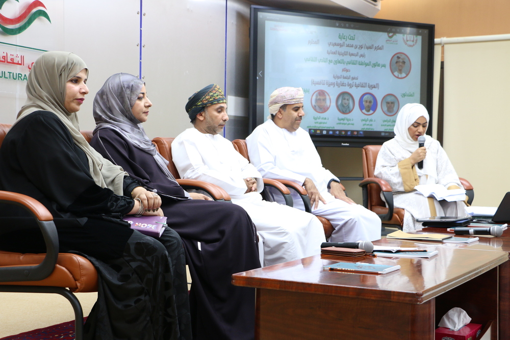 فيما تحدث الدكتور علي الريامي رئيس قسم التاريخ بجامعة السلطان قابوس عن الهوية الثقافية ودورها في حماية اللغة والتراث والتاريخ، متطرقًا إلى دور التاريخ في تشكيل الهوية الثقافية وآليات الحفاظ على الهوية.