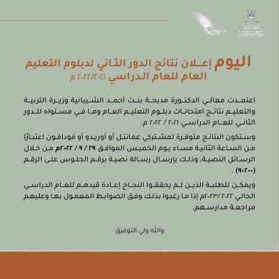 وستكون النتائج متوفرة لمشتركي عمانتل أو أوريدو أو فودافون اعتبارًا من الساعة الثانية مساء يوم الخميس الموافق ٢٩ /٢٠٢٢/٩م مـن خـلال الرسائل النصية، وذلك بإرسال رسالة نصية برقم الجلوس على الرقـم . (۹۰۳۰۰) ويمكن للطلبة الذين لم يحققوا النجاح إعادة قيدهـم للـعـام الدراسي الحالي ٢٠٢٣/٢٠٢٢م إذا ما رغبوا بذلك وفق الضوابط المعمول بها وعليهم مراجعة مدارسهم. والله ولي التوفيق