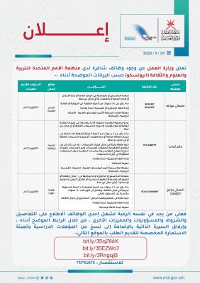 تعلن وزارة العمل عن وجود وظائف شاغرة لدى منظمة الأمم المتحدة للتربية والعلوم والثقافة (اليونسكو).