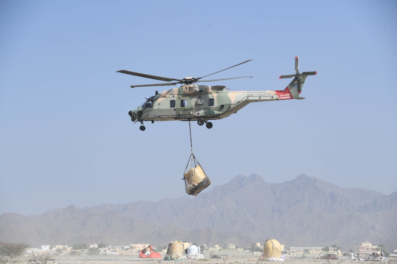 في إطار الجهود الوطنية والخدمات التنموية التي تقدمها قوات السلطان المسلحة للمواطنين، قام سلاح الجو السلطاني العماني صباح اليوم وبإسناد من الجيش السلطاني العماني، بتسيير إحدى طائراته العمودية إلى أهالي بلدة يقاء بولاية الرستاق بمحافظة جنوب الباطنة لنقل المواد الاستهلاكية إلى أهالي تلك المناطق وتسهيل مهمة إيصال هذه المواد للمواطنين القاطنين فيها نظراً لصعوبة إيصالها بواسطة الطرق البرية.