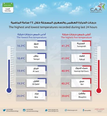 وهج_الخليج-مسقط سجلت ولاية السنينة أعلى درجة حرارة خلال 24ساعة الماضية، بينما سجلت سيق أدنى درجة حرارة حسب مقاييس هيئة الطيران المدني.