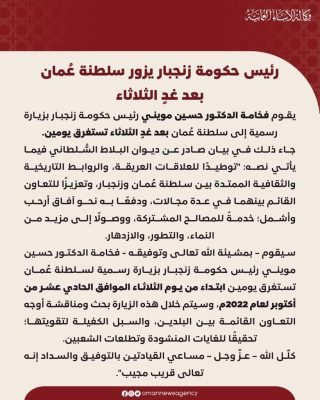 سيقوم فخامة الدكتور حسين مويني رئيس حكومة زنجبار بزيارة رسمية إلى سلطنة عُمان بعد غدٍ الثلاثاء تستغرق يومين سيتم خلالها بحث ومناقشة أوجه التعاون القائمة بين البلدين.