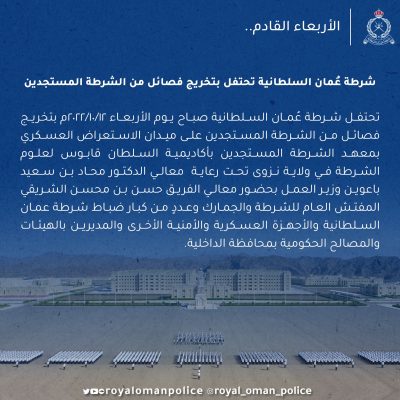 وهج الخليج-مسقط تحتفل شرطة عمان السلطانية بتخريج فصائل من الجنود المستجدين بعد غدا الأربعاء.