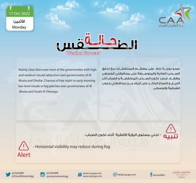 وهج_الخليج-مسقط أوضحت نشرة الأرصاد العمانية أن طقس اليوم صحو بشكل عام على معظم المحافظات مع تدفق السحب العالية والمتوسطة على محافظتي الوسطى وظفار