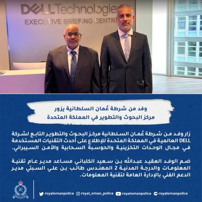 زار وفد من شرطة عمان السلطانية مركز البحوث والتطوير التابع لشركة DELL العالمية في المملكة المتحدة للإطلاع على أحدث التقنيات المستخدمة في مجال الوحدات التخزينية والحوسبة السحابية والأمن السيبراني.