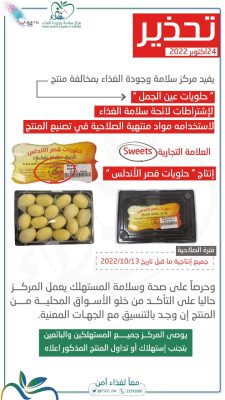 أفاد مركز سلامة وجودة الغذاء بمخالفة منتج “حلويات عين الجمل ” لإشتراطات لائحة سلامة الغذاء ” لاستخدامه مواد منتهية الصلاحية في تصنيع المنتج ”