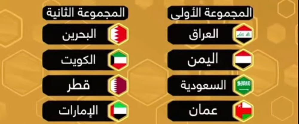 وأسفرت القرعة عن مواجهات مرتقبة أبرزها بين العراق المضيف والسعودية في المجموعة الأولى، وبين البحرين حاملة اللقب وقطر في المجموعة الثانية.