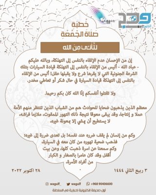 ⁃ إن من الإحسان عدم الإلقاء بالنفس إلى التهلكة، وبالله عليكم – عباد الله – أليس من الإلقاء بالنفس إلى التهلكة قيادة السيارات بتلك الشرعة الجنونية التي لا يقرها شرع ولا يقبلها عقل! أليس من الإلقاء بالنفس إلى التهلكة قيادة السيارة في حال شكر أو تعاطي مخدر.