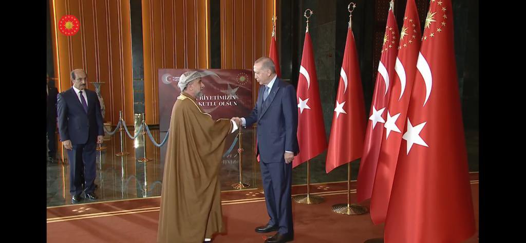 تحيات وتهاني حضرة صاحب الجلالة السلطان هيثم بن طارق حفظه الله ورعاه إلى فخامة الرئيس رجب طيب أردوغان، ينقلها سعادة السفير الدكتور قاسم الصالحي بمناسبة الذكرى “99” لإعلان الجمهورية التركية أثناء استقبال فخامة الرئيس للسفير بالقصر الرئاسي.