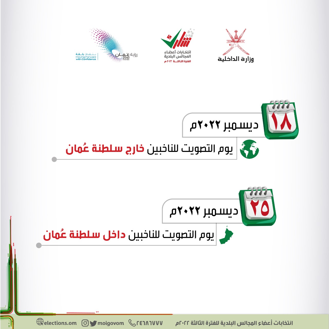 أصدر معالي السيد حمود بن فيصل البوسعيدي وزير الداخلية قراراً وزارياً بتحديد موعد يوم التصويت لانتخابات أعضاء المجالس البلدية للفترة الثالثة ، ليكون يوم الأحد 25 ديسمبر 2022م ، يسبقه موعد تصويت الناخبين الموجودين خارج سلطنة عُمان يوم الأحد 18 ديسمبر 2022م ، وستقوم الوزارة في مرحلة لاحقة بتوضيح الخطوات والإجراءات اللازمة لعملية التصويت .