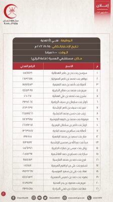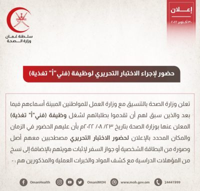 قامت وزارة الصحة بالتنسيق مع وزارة العمل بنشر إعلان يوضح بأن على المواطنين المبينة أسماءهم والذين سبق لهم أن تقدموا بطلباتهم لشغل وظيفة (فني”أ” تغذية) بأن عليهم الحضور في الزمان والمكان المحدد بالإعلان لحضور الاختبار التحريري.