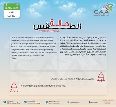 وهج الخليج-مسقط أوضحت نشرة الأرصاد العمانية أن طقس اليوم صحو إلى غائم جزئيا على المحافظات الشمالية، مع فرص لهطول امطار متفرقة على محافظة مسندم والمناطق الساحلية لبحر عمان وعلى جبال الحجر.