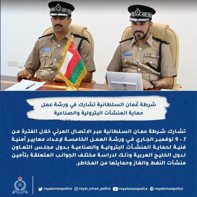 تشارك شرطة عمان السلطانية عبر الاتصال المرئي خلال الفترة من 7-9نوفمبر الجاري في ورشة العمل الخامسة لإعداد معايير أمنية فنية لحماية المنشآت البترولية والصناعية بدول مجلس التعاون لدول الخليج العربية وذلك لدراسة مختلف الجوانب المتعلقة بتأمين منشآت النفط والغاز وحمايتها من المخاطر.