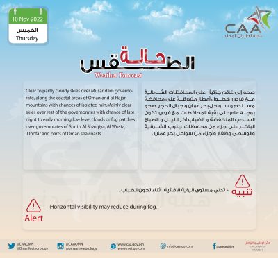 كما أن الطقس صحو بوجه عام على بقية المحافظات مع تدفق السحب المنخفضة والضباب آخر الليل والصباح الباكر على أجزاء من محافظات جنوب الشرقية والوسطى وظفار وأجزاء من سواحل بحر عمان.