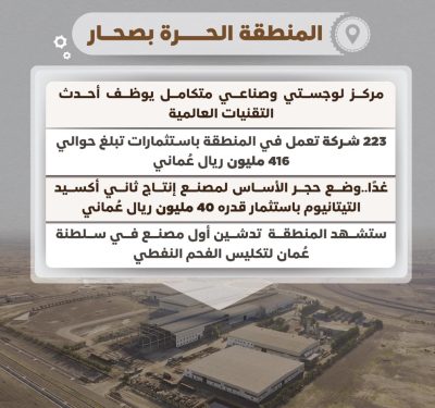 تشهد المنطقة الحرة بصحار وضع حجر الأساس لمصنع إنتاج ثاني أكسيد التيتانيوم غدًا الأحد باستثمار قدره 40 مليون ريال عُماني وتدشين أول مصنع في سلطنة عُمان لتكليس الفحم النفطي بإجمالي استثمارات قدرت بحوالي 60 مليون ريال عُماني.