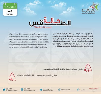 أوضحت نشرة الأرصاد العمانية أن طقس اليوم صحو بشكل عام على معظم المحافظات مع تدفق السحب علي محافظة مسندم وفرص تشكل السحب على جبال الحجر خلال فترة الظهيرة.