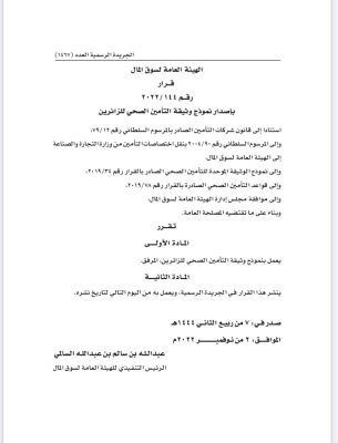 أصدر عبدالله بن سالم السالمي الرئيس التنفيذي للهيئة العامة لسوق المال قراراً بإصدار نموذج وثيقة التأمين الصحي للزائرين.