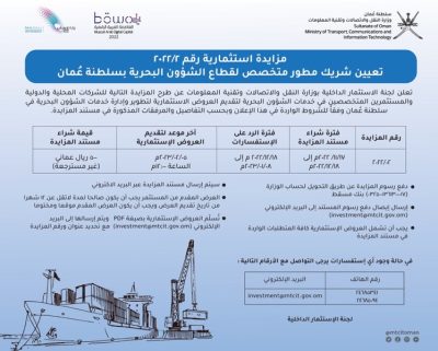 تعلن لجنة الاستثمار بوزارة النقل والاتصالات وتقنية المعلومات عن طرح مزايدة استثمارية لتطوير وإدارة خدمات الشؤون البحرية في سلطنة عُمان.
