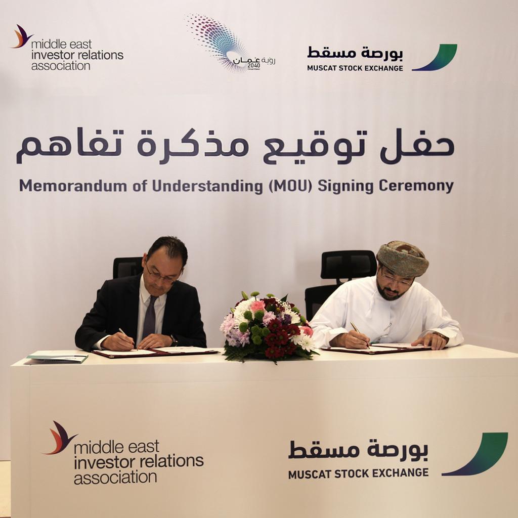 وقعت بورصة مسقط على مذكرة تفاهم مع جمعية علاقات المستثمرين في الشرق الأوسط، بهدف تطوير أعمال علاقات المستثمرين في البورصة وتعزيز الشفافية.