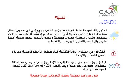 استمرار تأثر أجواء سلطنة عُمان بإخدود من منخفض جوي يؤدي إلى هطول أمطار متفاوتة الغزارة تكون رعدية أحياناً مصحوبة برياح نشطة على محافظات مسندم وشمال الباطنة وجنوب الباطنة وهطول أمطار تكون رعدية أحياناً على جبال الحجر (الحجر الغربي).. والله أعلم