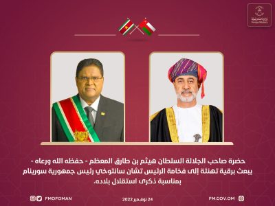 حضرة صاحب الجلالة السلطان المعظم ـ حفظه الله ورعاه ـ يبعث برقية تهنئة إلى فخامة الرئيس تشان سانتوخي رئيس جمهورية سورينام بمناسبة ذكرى استقلال بلاده.