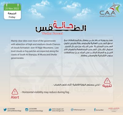 أوضحت نشرة الأرصاد العمانية أن طقس اليوم صحو بشكل عام على معظم المحافظات مع تدفق السحب العالية والمتوسطة واحتمال تشكل السحب المحلية على أجزاء من جبال الحجر، مع احتمالية تشكل السحب المنخفضة والضباب آخر الليل والصباح الباكر على أجزاء من محافظات جنوب الشرقية والوسطى وظفار.