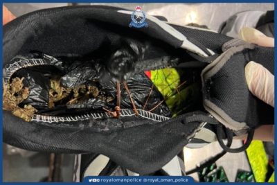شرطة عمان السلطانية تلقي القبض على شخصين من جنسية أفريقية أثناء محاولتهما تهريب كميات من المخدرات والمؤثرات العقلية عبر مطار مسقط الدولي بعد إخفائها في مجموعة من الأحذية، وتستكمل الإجراءات القانونية بحقهما.