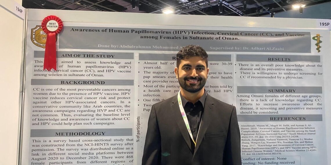 والملصق يعرض قياس مدى وعي النساء بفيروس الورم الحليمي البشري (HPV) وسرطان عنق الرحم في سلطنة عمان، وكشفت نتائج البحث عن رغبة النساء لتلقي المزيد من المعرفة فيما يتعلق بسرطان عنق الرحم وأسبابه وطريقة الوقاية منه والكشف المبكر عنه.