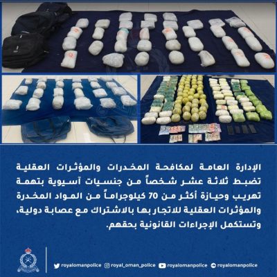 ضبط ثلاثة عشر شخصاً من جنسيات آسيوية بتهمة تهريب وحيازة أكثر من ٧٠ كيلوجراماً من المواد المخدرة والمؤثرات العقلية للاتجار بها بالاشتراك مع عصابة دولية..