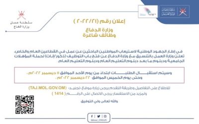 تُعلن وزارة العمل بالتنسيق مع وزارة الدفاع عن فتح باب التوظيف (ذكور/إناث) لحملة المؤهلات الجامعية ودبلوم ما بعد دبلوم التعليم العام ودبلوم التعليم العام.ابتداءً من يوم غد وحتى تاريخ 2022/12/22.