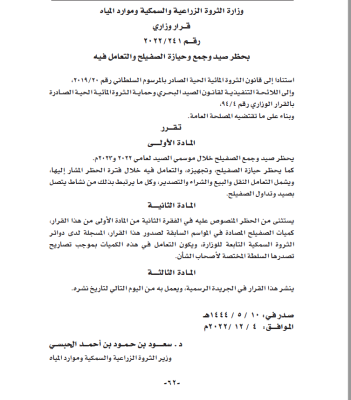 أصدر معالي الدكتور سعود بن حمود بن أحمد الحبسي، وزير الثروة الزراعية والسمكية وموارد المياه، قرارا وزاريا رقم 241 لسنة 2022، بحظر صيد وجمع وحيازة الصفيلح والتعامل فيه.
