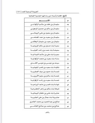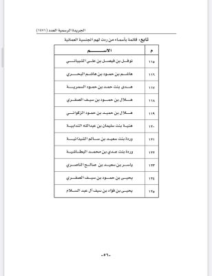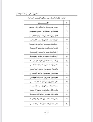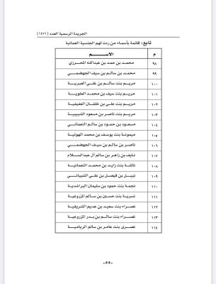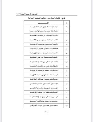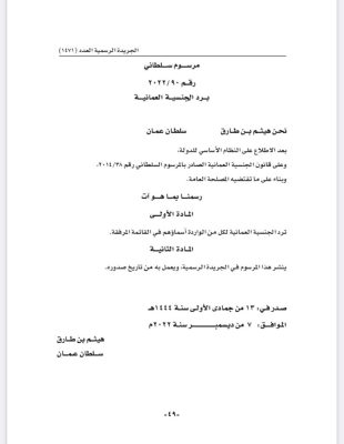 أصدر حضرة صاحب الجلالة السلطان هيثم بن طارق المعظم حفظه الله ورعاه مرسـومًا سـلطانيًا ساميًا برد الجنسية العمانيـة لكل من الواردة أسماؤهم في القائمة المرفقة: