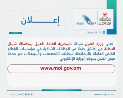 وهج الخليج - مسقط تعلن وزارة العمل ممثلة بالمديرية العامة للعمل بمحافظة شمال الباطنة عن إطلاق حزمة من الوظائف الشاغرة في مؤسسات القطاع الخاص العاملة بالمحافظة